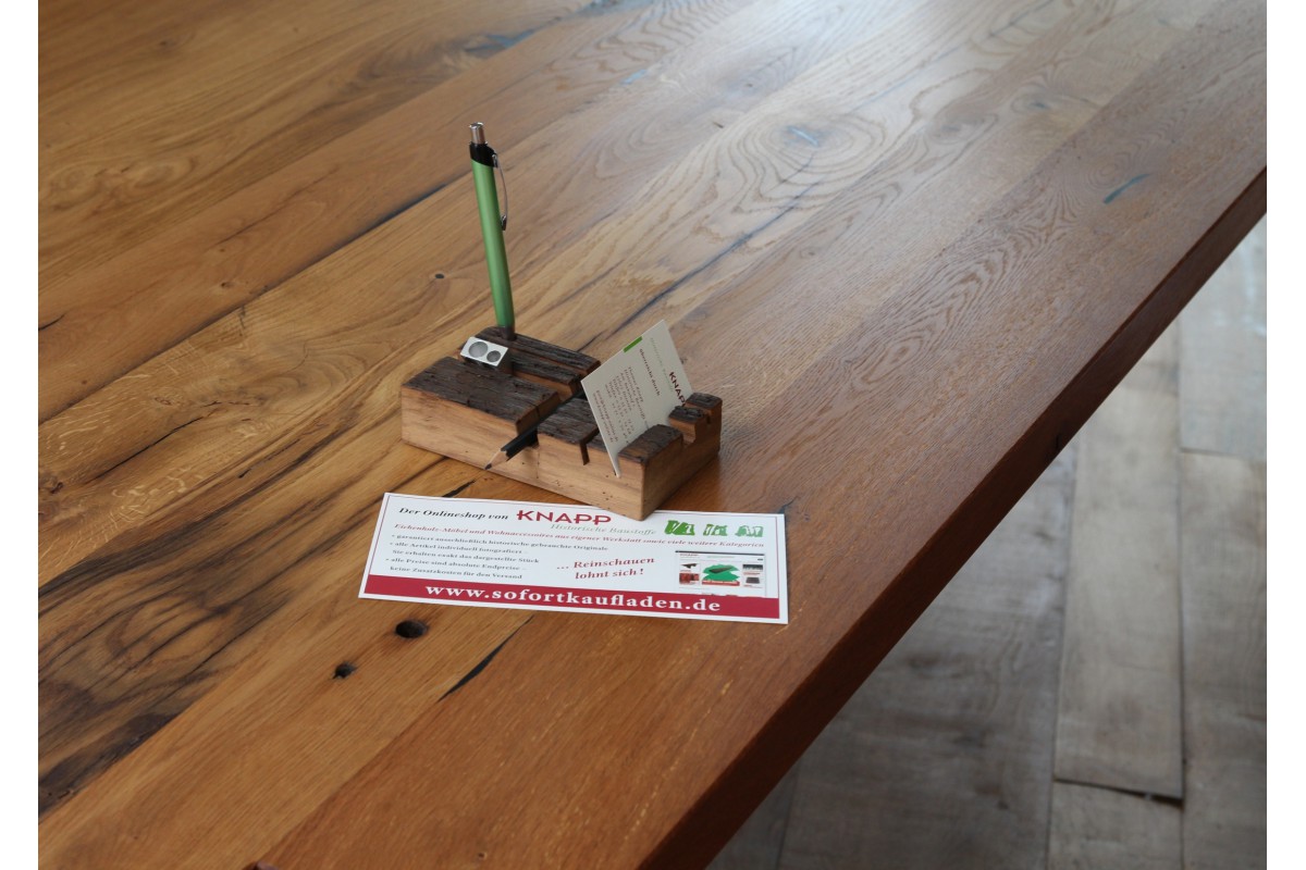 Ursprünglich sollten diese kleinen, einfach gearbeiteten Antikholz-Eichenklötzchen »Schreibtischhelfer« heißen. Da wir uns jedoch ob ihrer vielfältigen Nutzungsmöglichkeiten schon auf den Zusatz »multiple choice« festgelegt hatten, empfanden wir den »Schreibtischhelfer« dann doch als unnötige Einschränkung Ihrer Wahlfreiheit, wofür Sie ihn nutzen wollen: am Schreibtisch, in der Werkstatt, über der Kochecke, neben der Stereoanlage, für Visitenkarten, Smartphones, Bankkarten, Stifte, Kochrezepte, Merkzettel, TAN-Generatoren oder Tablets. Sicher bei allen Möglichkeiten ist jedoch, daß die »multiple choice«-Helfer aus altem Eichenholz Ihnen helfen (können), Ordnung zu halten - wofür wir aus selbstverständlichen Gründen ausnahmsweise keine Garantie übernehmen.