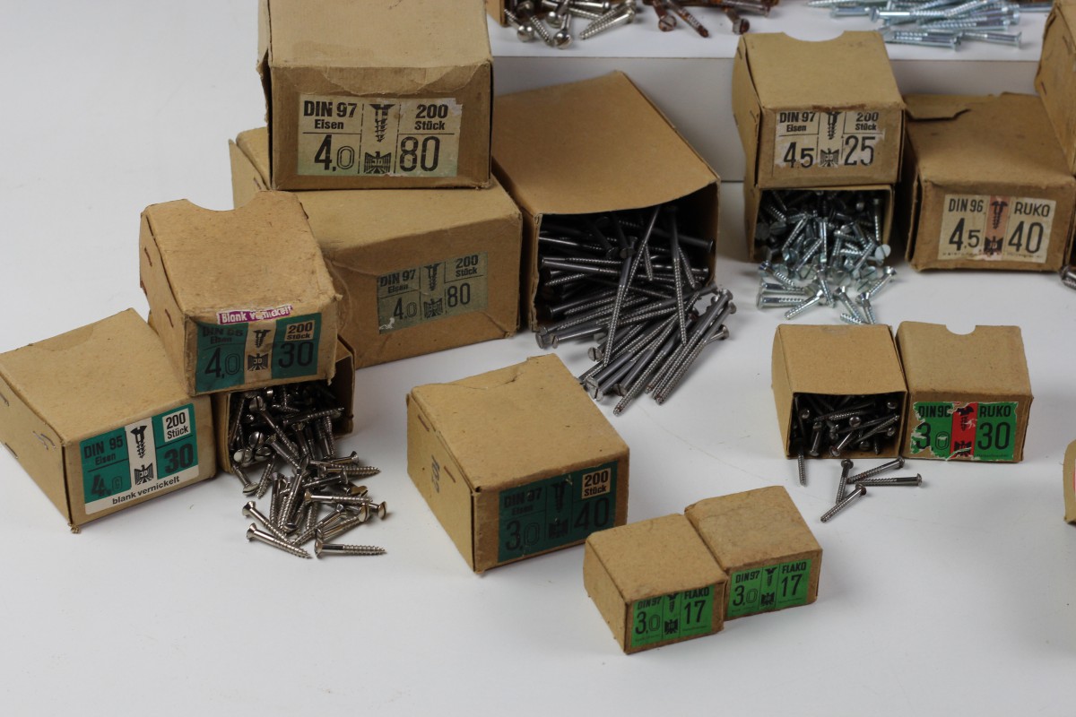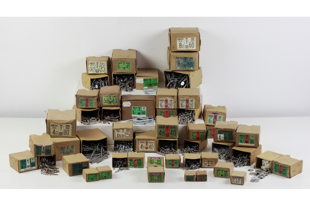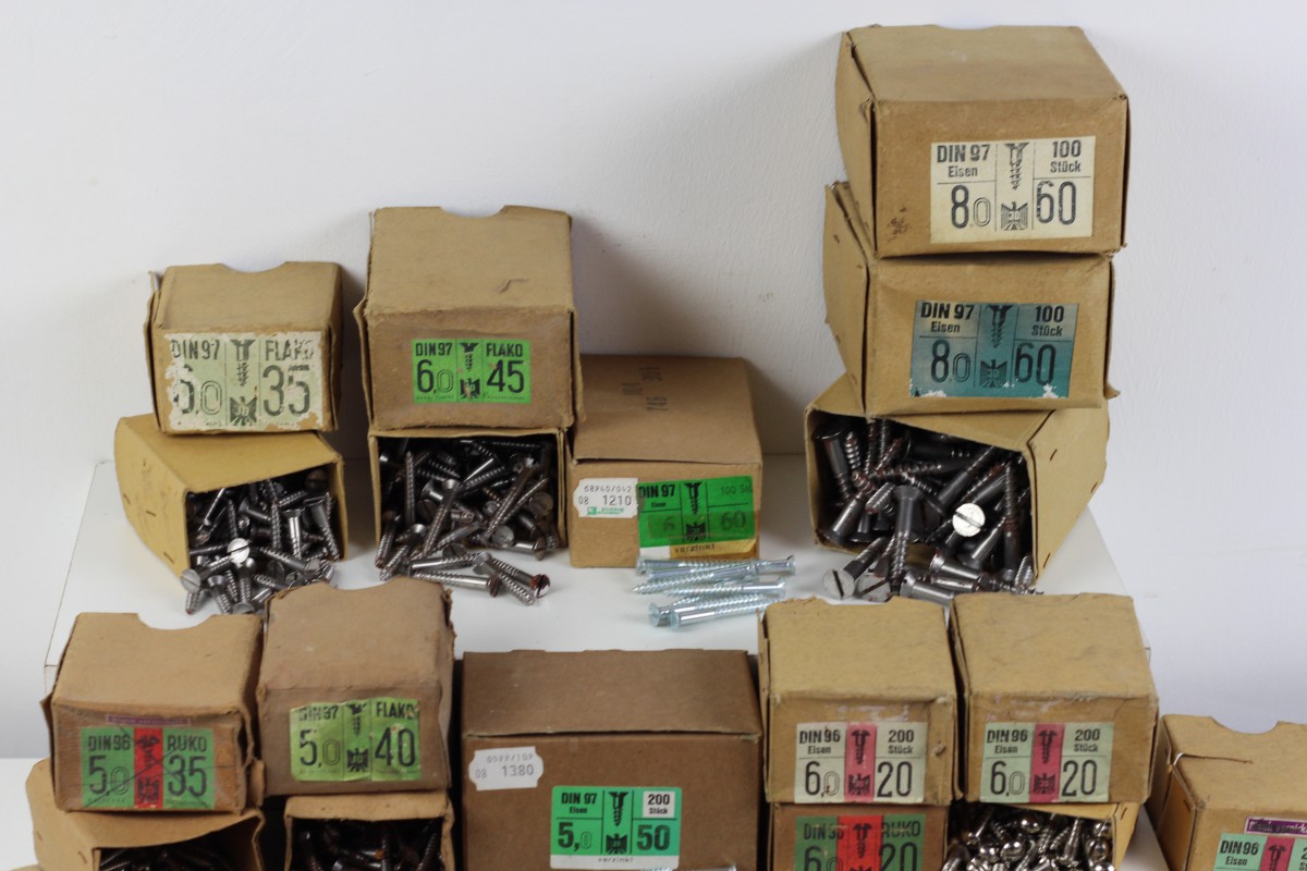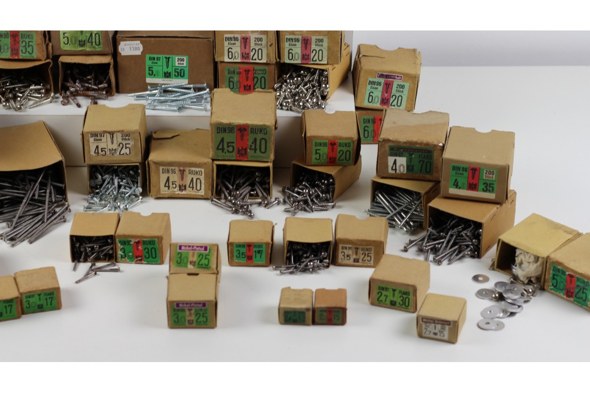 Es handelt sich um originale Kartons, die zum größten Teil immer noch verschlossen sind! Die Schrauben wurden nie verwendet und sind somit unbenutzt. Einige Kartons wurden vom damaligen Tischler allerdings geöffnet und ein Teil des Inhalts daraus entnommen. Sie erhalten Ihr Sortiment, wie wir es auf den Bildern dargestellt haben.
