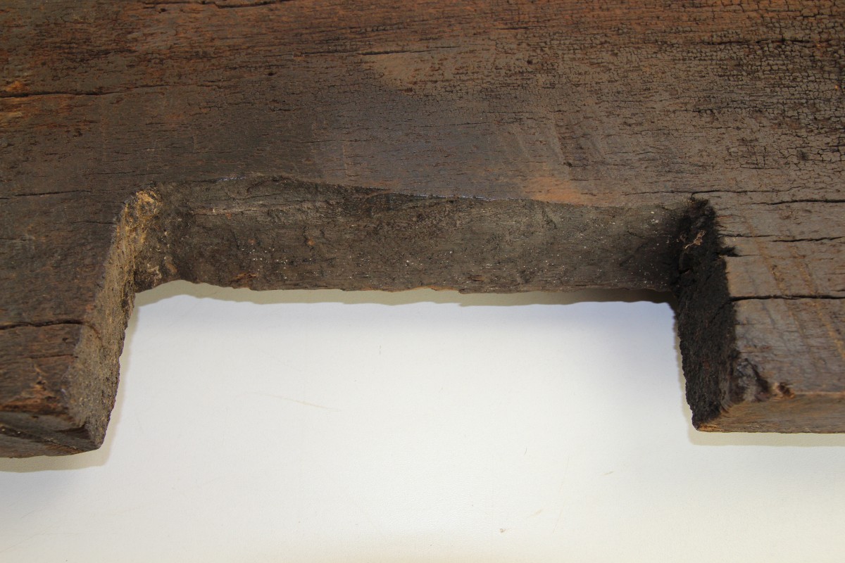 Links und rechts jeweils auf einem alten Eichen-Deckenbalken aufliegend ist es im Laufe der Zeit durch das Gewicht des auf ihm lagernden Erntegutes zur Mitte hin gefährlich durchgebogen - aber es hat gehalten ohne zu brechen! Bei Ihren Überlegungen für eine mögliche Zweitverwendung sollten Sie die starke Durchbiegung des antiken Brettes berücksichtigen!